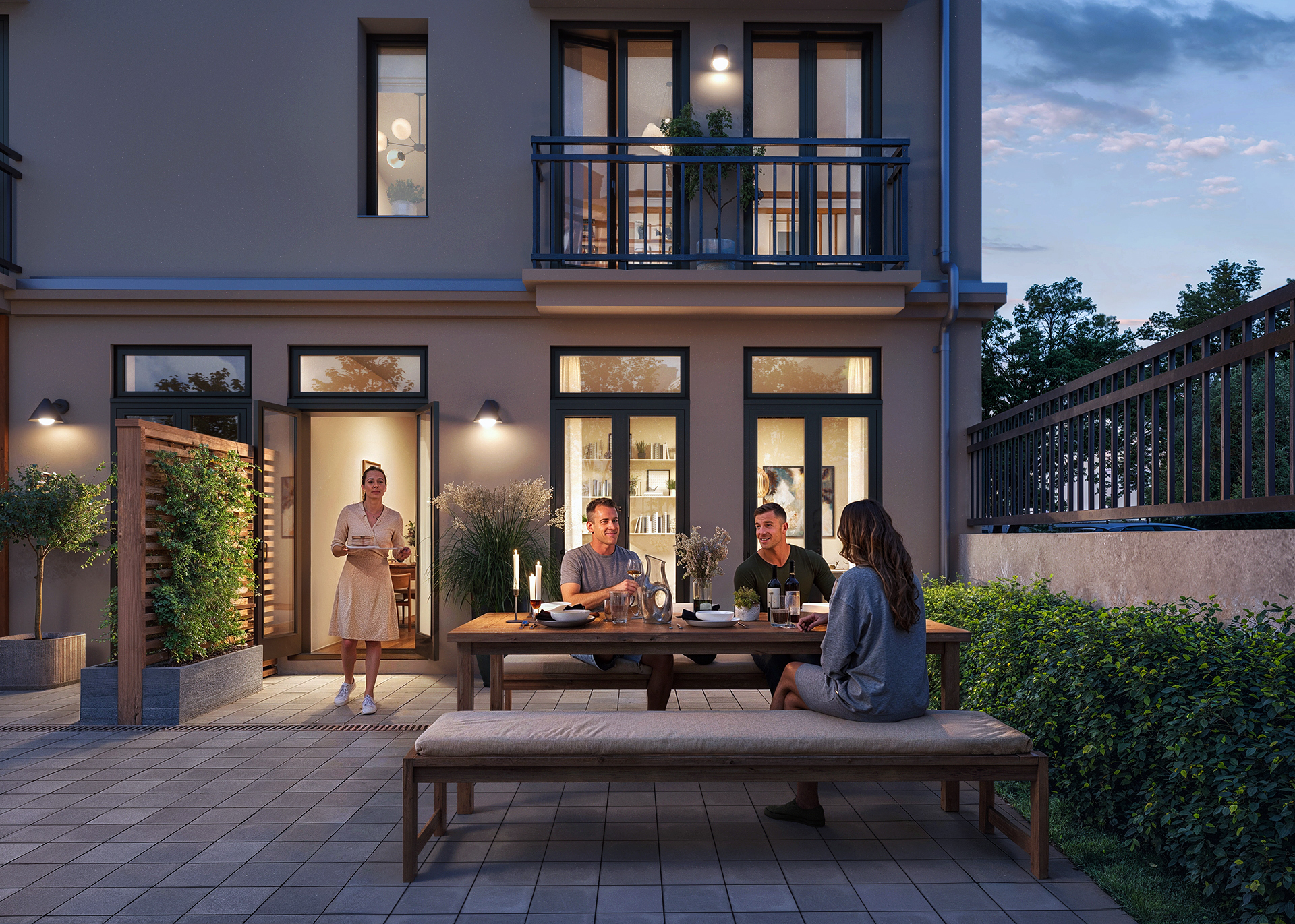Den vackert planerade innergården blir en naturlig samlingspunkt för dig och dina grannar. Här kan ni njuta av träd och blommande buskar som skiftar med årstiderna – från vårens forsythia och körsbärsträd till höstens sprakande lönnar och limegula hortensior.